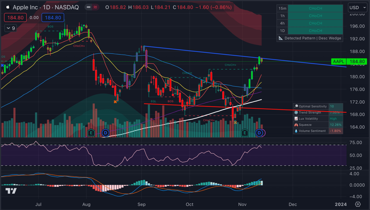 You’re going to hate me for this, but there’s a theme here. MSFT shouldn’t have even made it this high, but here we are. The run is out of steam. MSFT is overbought big time and has been hanging out in the Lux Algo sell zone for a week. You can see the MACD starting to roll over and we think it’s time. We’re short on Microsoft from here.