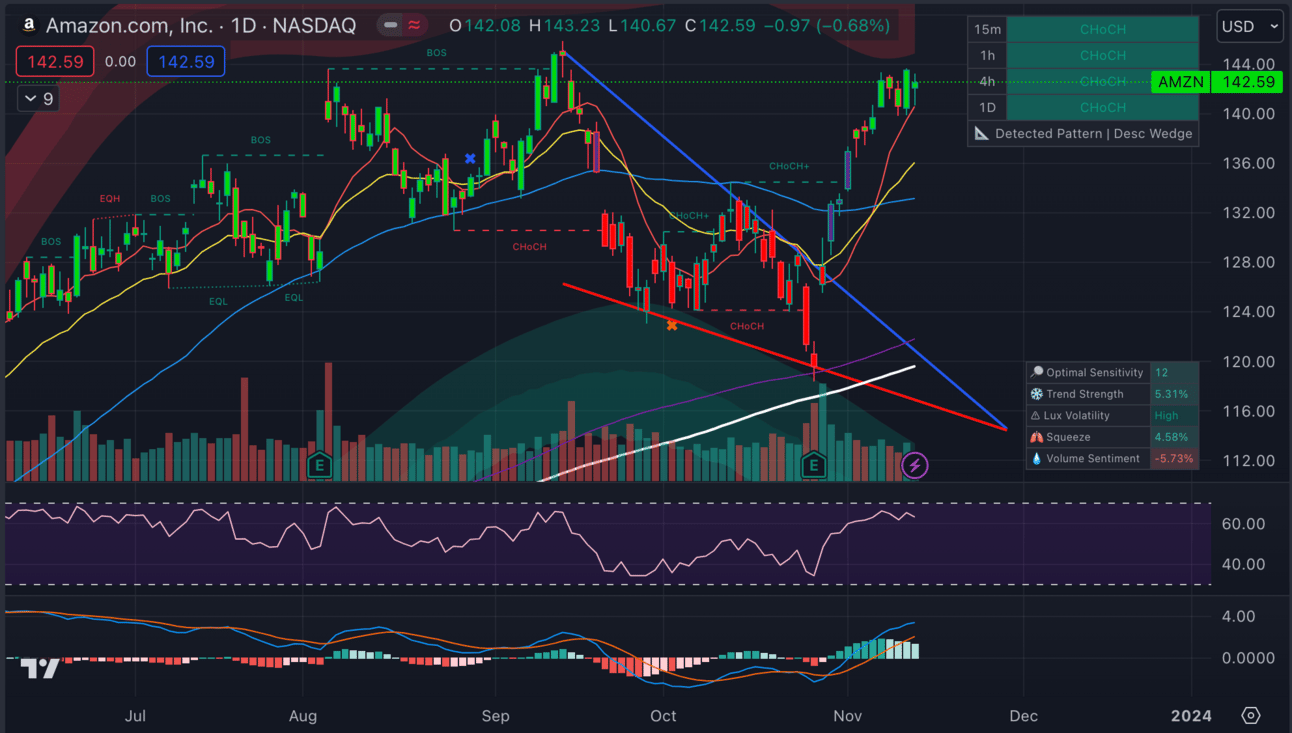 We recommended AMZN on Nov 1st and it ran 7.5% from there, but the party is over. The RSI has reached overbought territory and the MACD is rolling over. AMZN should come down from here.